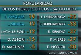 El presidente Tabaré Vázquez y su antecesor José Mujica aparecen con un saldo de popularidad de +19 y +12 puntos, respectivamente. Si bien el signo es positivo, no da para tirar manteca al techo.